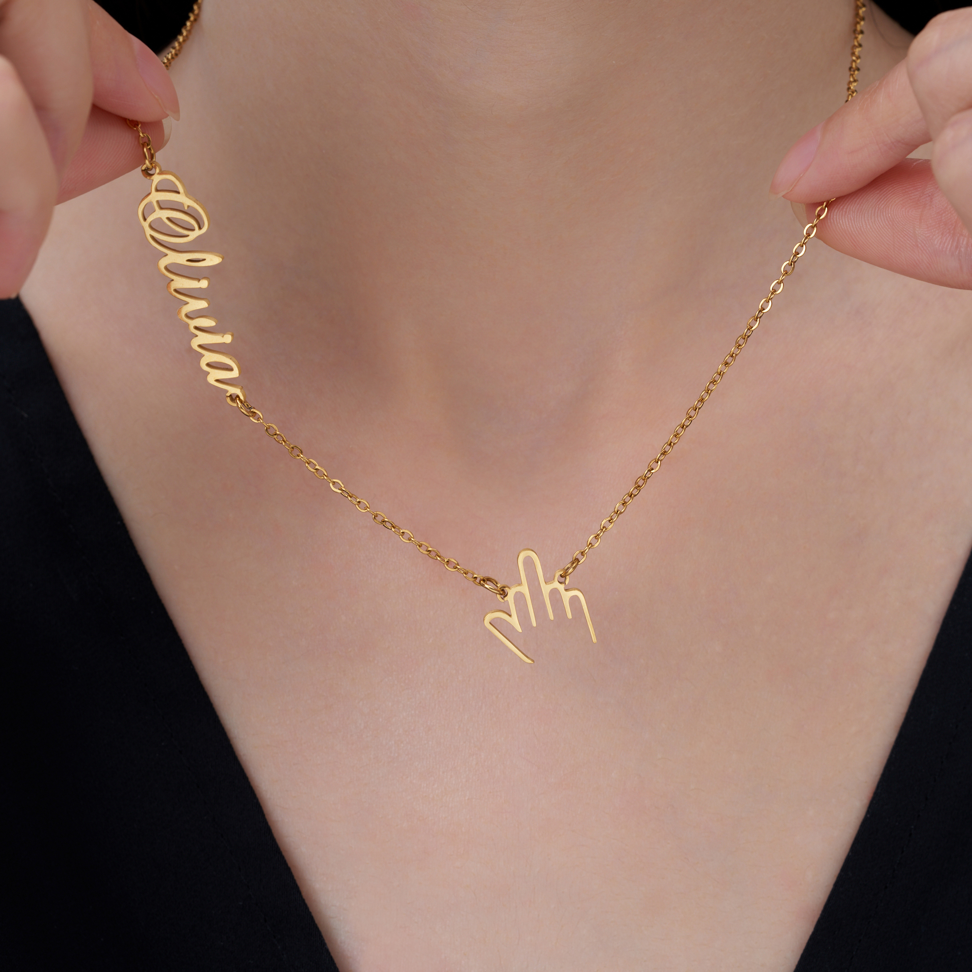 Bold Minimalist Design - This sideways name necklace pairs a tiny middle finger charm with clean, simple lettering. The playful “F**k You” gesture adds a cheeky edge while keeping a sleek, everyday look that stands out without being loud.